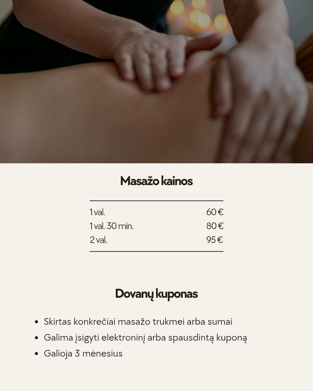 Labas, su tavim sveikinasi Vaidė ir Agnė – masažo terapeutės ir entuziastingos keliautojos gyvenimu. Kai nusprendėme keisti veiklos sritis, susitikome besimokydamos masažo. Pusantrų metų intensyvių studijų, masažo stažuotė Kipre, dalyvavimas Lietuvos masažo čempionate, sporto renginiuose, kelionės – visa tai ir sudėliojo bendros masažo veiklos viziją. Šiandien mes džiaugiamės galėdamos pakviesti tave į mūsų masažo studiją, kur šiltai pasitiksime ir švelniai stipriomis rankomis suteiksime kūnui labiausiai reikiamą terapiją.